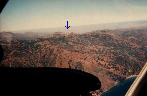 Turning final for runway 22. The arrow points to the far end of the runway. The dark area in the lower right is the Pacific Ocean. This is a really lousy picture. I tried to make the runway stand out by enhancing the contrast, but this was the best I could do.