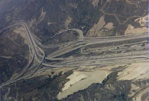 This is the Newhall Pass, about 10 miles north of Van Nuys. If I remember correctly, this is the junction of I-5 and State Road 14 leading out of the San Fernando Valley. Apparently, this interchange has collapsed twice in earthquakes.